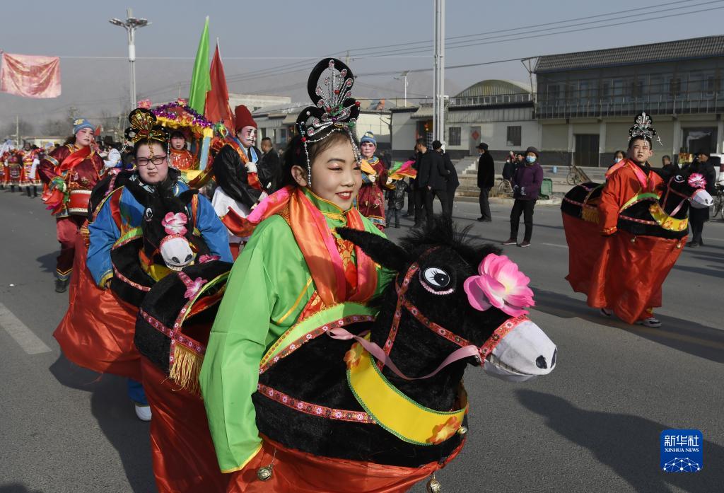 1月30日,在甘肅省臨夏回族自治州永靖縣太極鎮,村民表演社火節目“騎毛驢”。