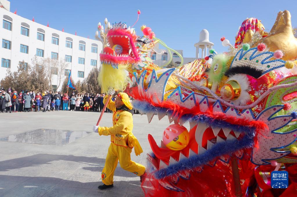 1月30日,甘肅省阿克塞哈薩克族自治縣社火隊在進行舞龍表演。