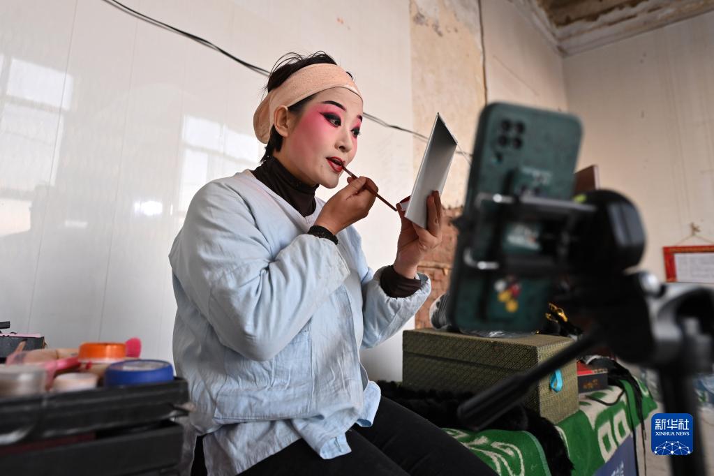 1月30日,在山西省太原市清徐縣孟封村,太原市晉劇藝術研究院實驗二團演員在后臺直播化裝。