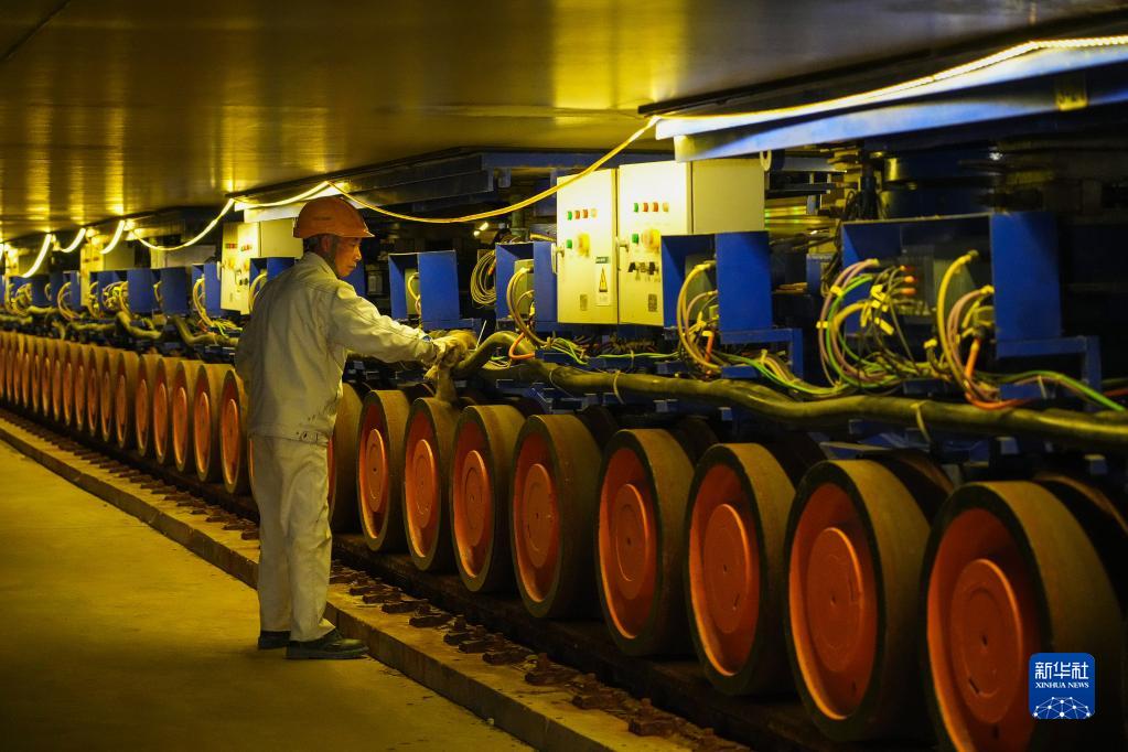 在中交四航局珠海牛頭島沉管智慧工廠,施工人員為承載深中通道海底隧道最后一個管節(非標準管節、含最終接頭)的智能臺車進行保養(1月30日攝)。