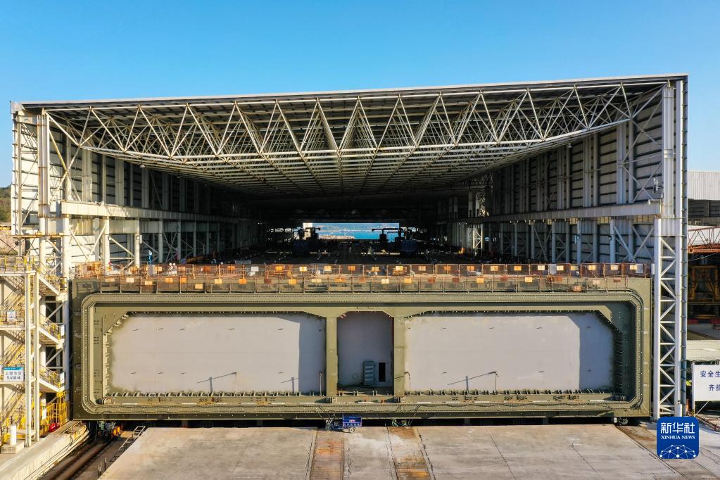 這是在中交四航局珠海牛頭島沉管智慧工廠拍攝的深中通道海底隧道最后一個管節(非標準管節、含最終接頭)(1月30日攝,無人機照片)。
