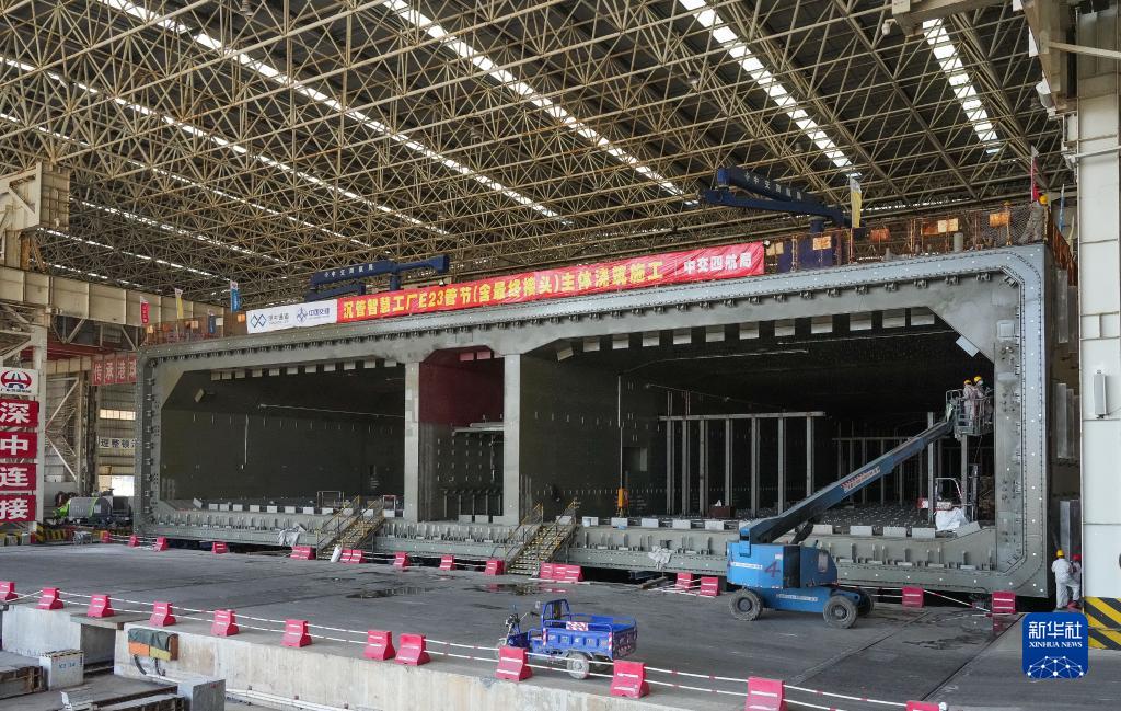 在中交四航局珠海牛頭島沉管智慧工廠,施工人員為深中通道海底隧道最后一個管節(非標準管節、含最終接頭)一次舾裝做準備工作(1月30日攝)。