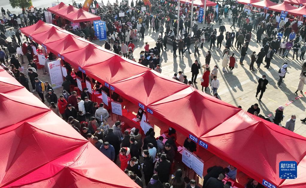 1月31日,在湖南省衡陽市衡山縣體育廣場,求職者在衡陽市2023年春風行動暨就業援助月專場招聘會上尋找合適的崗位(無人機照片)。