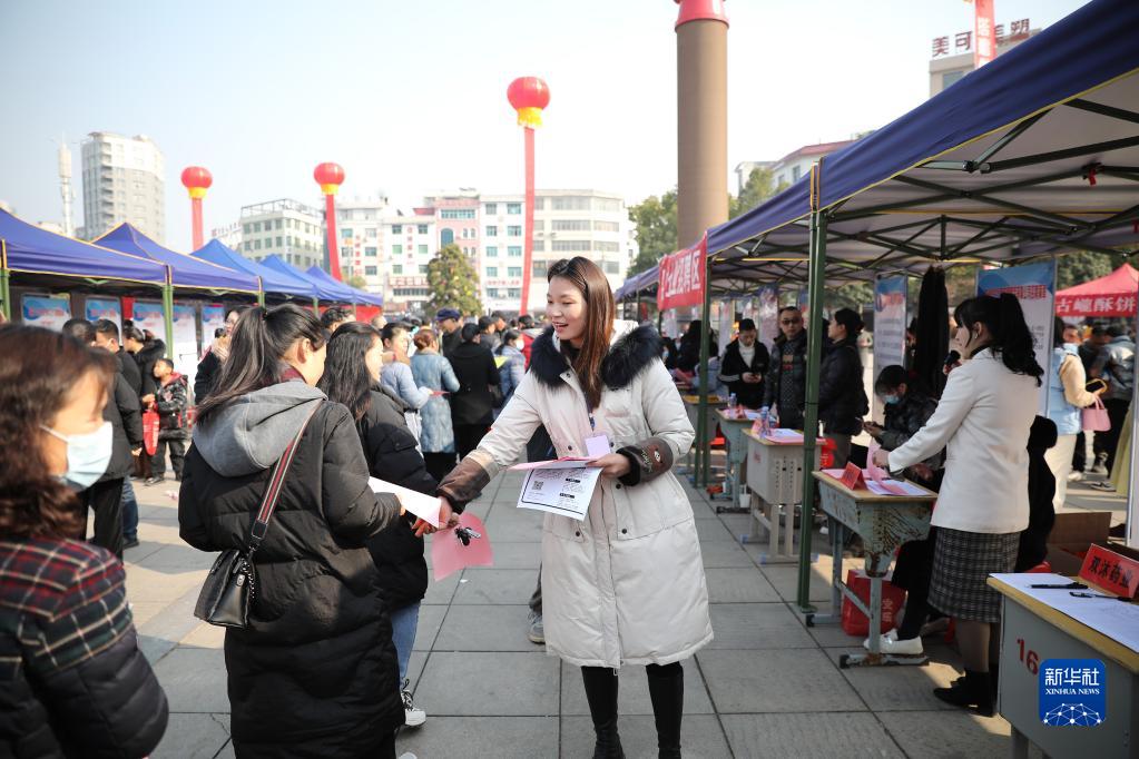 1月31日,在湖南省龍山縣2023年春風行動暨就業援助月現場招聘會上,一單位招聘人員向求職者發放崗位信息宣傳單。