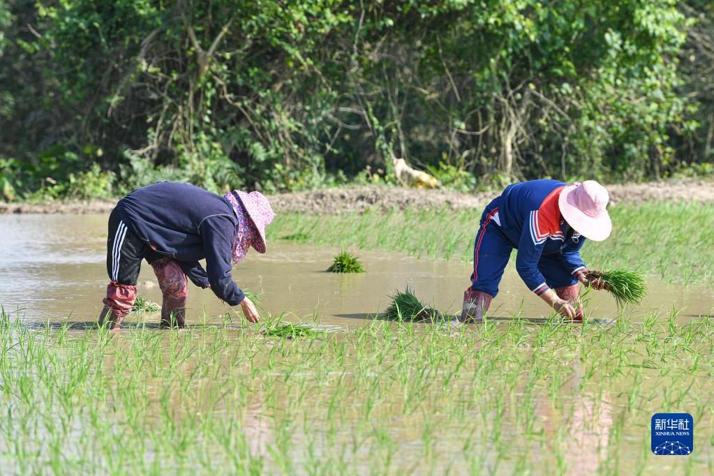 1月30日,農民在??谌〖墲竦毓珗@周邊的稻田里種植早稻。