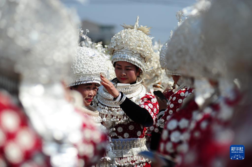 當日,在貴州省黃平縣谷隴鎮,26個村(居)的千余名苗族同胞身著銀飾盛裝,跳板凳舞、吹蘆笙、唱苗歌,載歌載舞喜迎元宵佳節。