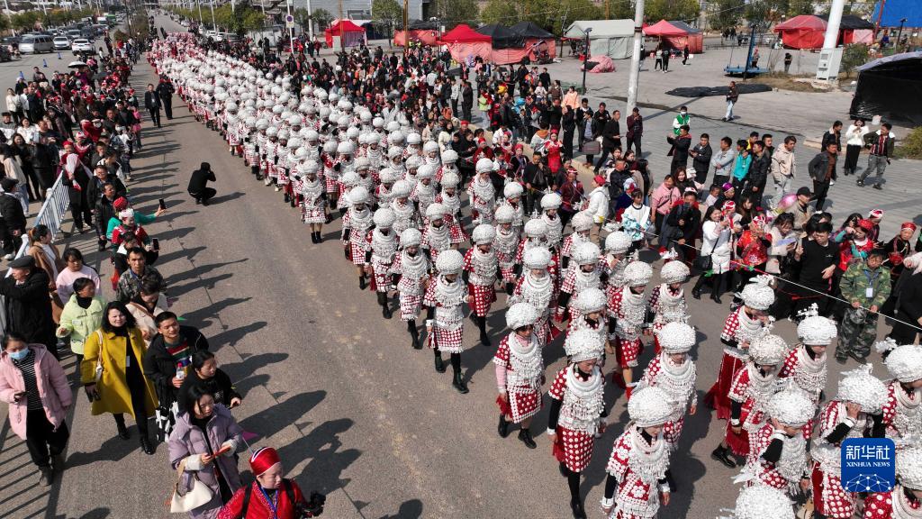 1月31日,苗族同胞在貴州省黔東南苗族侗族自治州黃平縣谷隴鎮盛裝巡游(無人機照片)。