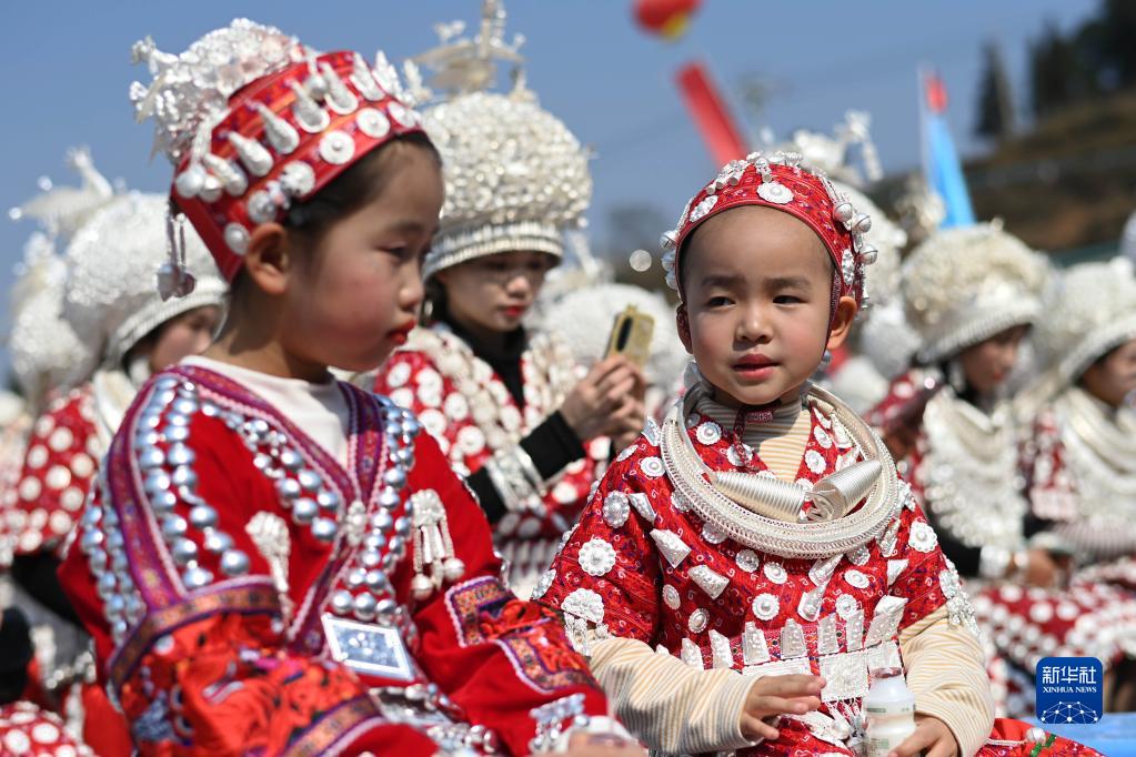當日,在貴州省黃平縣谷隴鎮,26個村(居)的千余名苗族同胞身著銀飾盛裝,跳板凳舞、吹蘆笙、唱苗歌,載歌載舞喜迎元宵佳節。