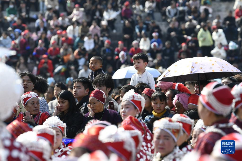 1月31日,群眾在貴州省黔東南苗族侗族自治州黃平縣谷隴鎮觀看盛裝巡游。