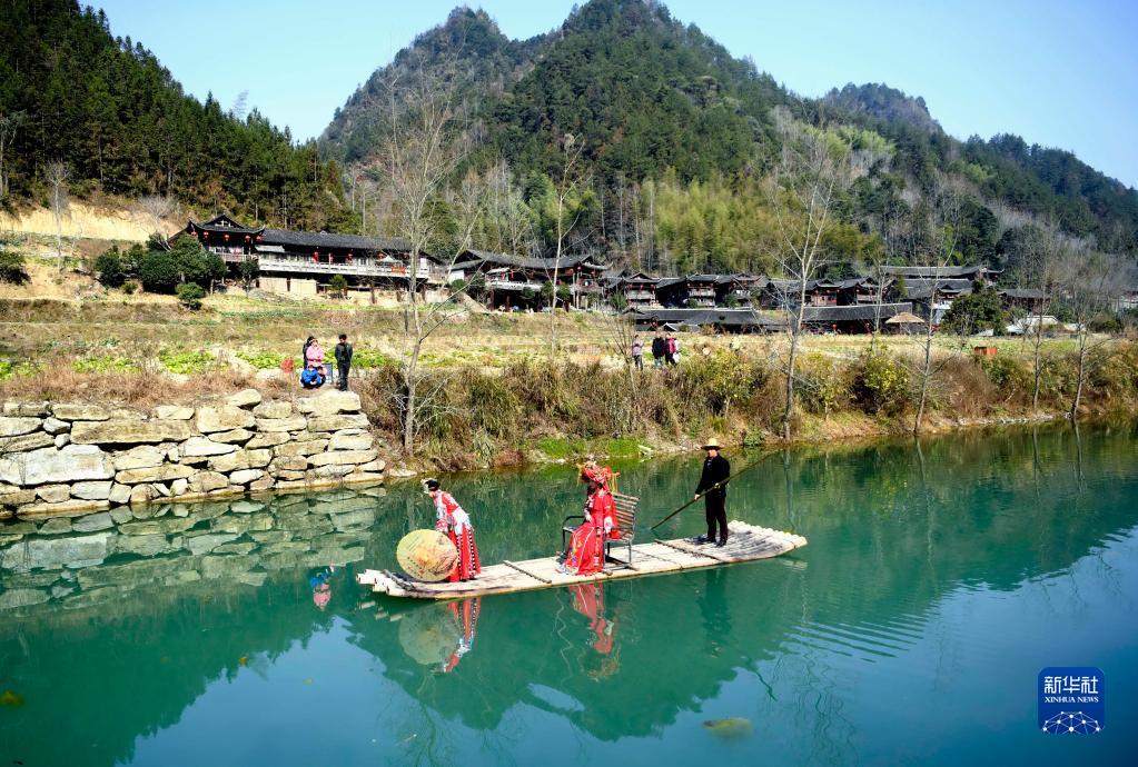 1月31日,在宣恩縣彭家寨風景區的古吊腳樓前,游客乘坐竹筏在小河中游玩。
