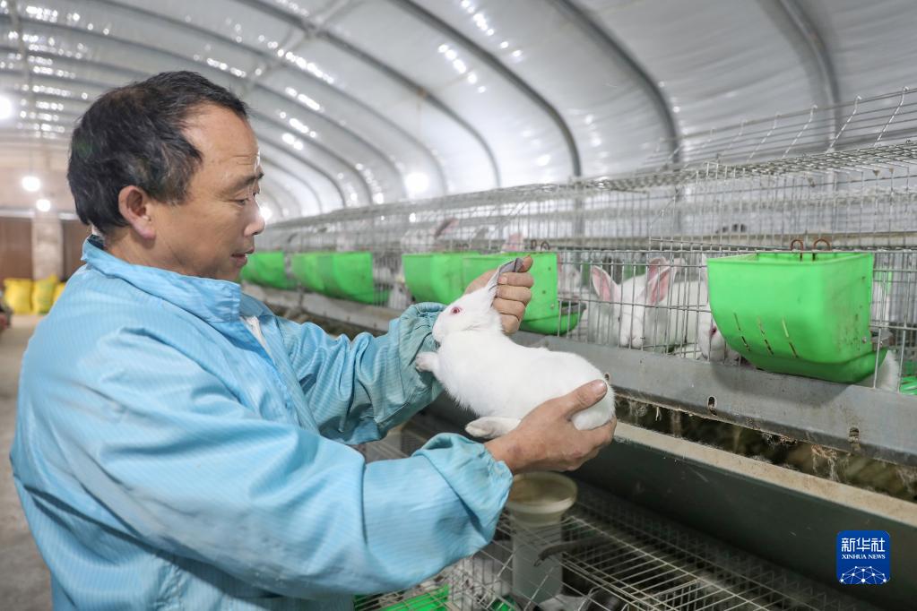 1月31日,華鎣市永興鎮馬架坪村肉兔飼養基地的工作人員觀察肉兔的健康狀況。