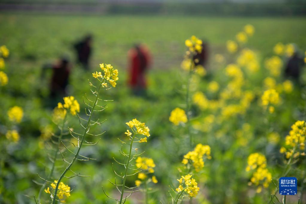 1月30日,在湖南省永州市道縣白馬渡鎮新團結村,農民在田間管護油菜。