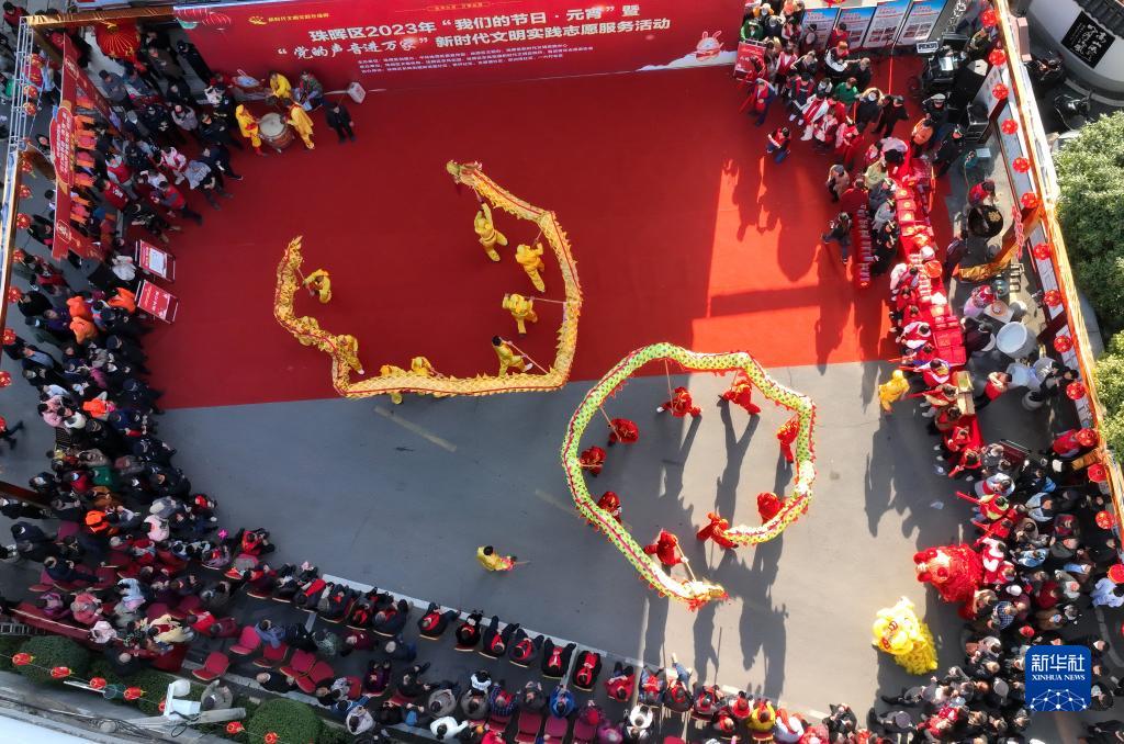 1月31日,在湖南省衡陽市珠暉區東風街道前進里社區,人們舞龍舞獅迎接元宵節的到來(無人機照片)。