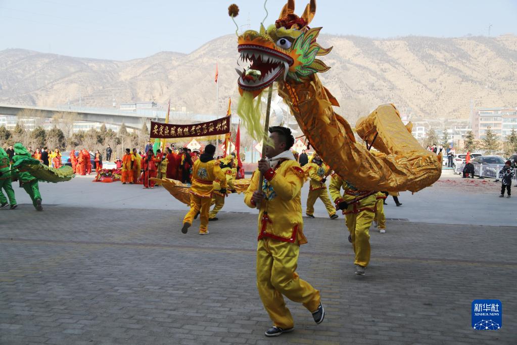 1月31日,甘肅省定西市安定區鳳翔鎮的社火隊員在表演舞龍。