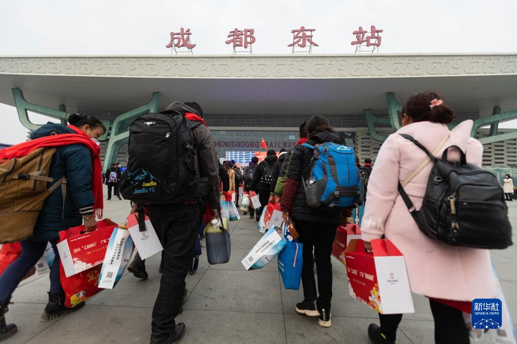 2月1日,來自四川省遂寧市的務工人員乘坐務工大巴直通車來到成都東站,準備乘坐高鐵。