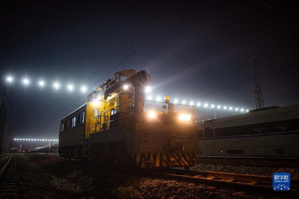 1月31日晚,在武漢動車段,接觸網檢修作業車準備出庫。
