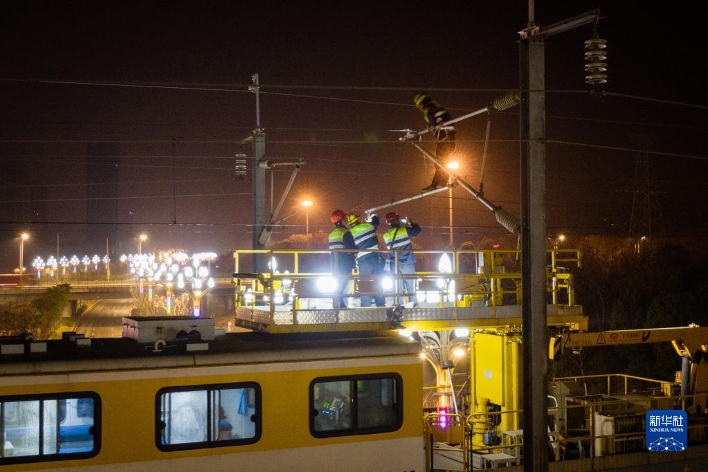 鐵路接觸網供電設備是否正常運轉,關系著每趟列車的安全運行。春運期間,中國鐵路武漢局集團有限公司武漢供電段高鐵接觸網檢修工人利用0點到6點的“天窗點”,頭戴安全帽、身穿反光服,對京廣高鐵武漢段的接觸網進行檢修、維護,為高鐵供電保駕護航。