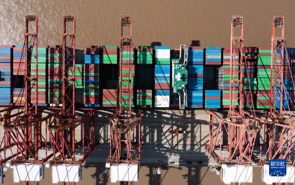 在寧波舟山港金塘港區大浦口集裝箱碼頭,一艘貨輪正在碼頭卸貨(1月31日無人機拍攝)。