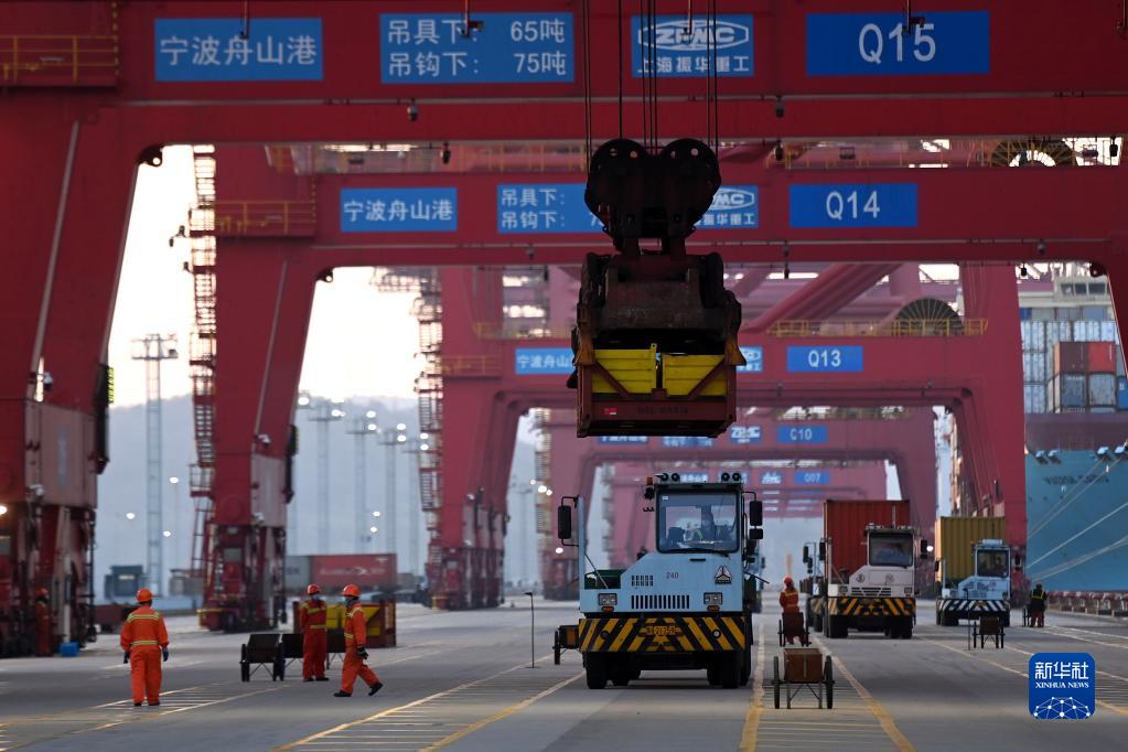 1月31日,卡車在寧波舟山港穿山港區集裝箱碼頭裝卸。