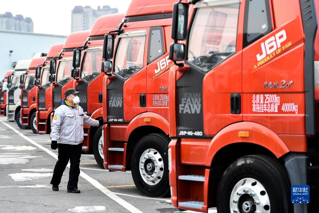 在位于吉林長春的一汽解放智慧物流公司整車物流部停車場,員工對即將轉運交付的車輛進行巡檢(1月31日攝)。