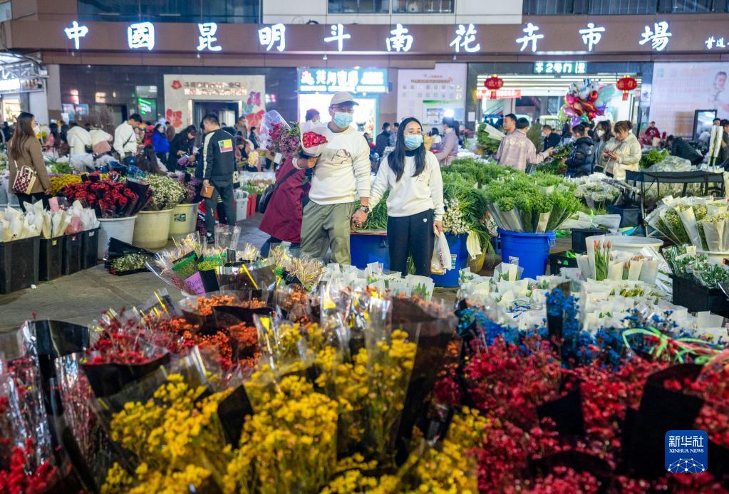 1月31日,游客在昆明斗南夜間花市參觀游覽、選購花卉。