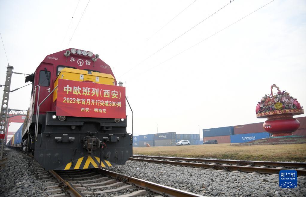 當日,滿載日用百貨的X8151次中歐班列從西安國際港站駛出,開往白俄羅斯首都明斯克。2023年1月,陜西中歐班列開行突破300列,達到346列,創歷史同期最好成績,取得新年開門紅。