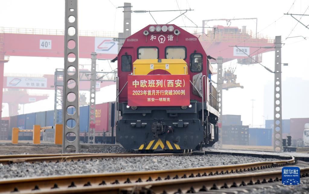 當日,滿載日用百貨的X8151次中歐班列從西安國際港站駛出,開往白俄羅斯首都明斯克。2023年1月,陜西中歐班列開行突破300列,達到346列,創歷史同期最好成績,取得新年開門紅。