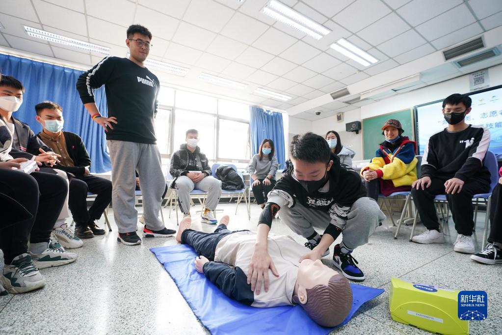 楊曦(下)在學校參加冬奧志愿者急救技能培訓(2021年11月27日攝)。