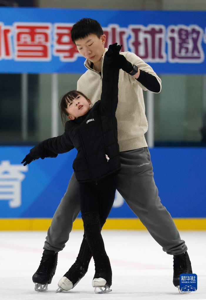 楊曦(右)在冰上訓練中為8歲的小學員鄭詩琪指導花樣滑冰技術動作(1月15日攝)。