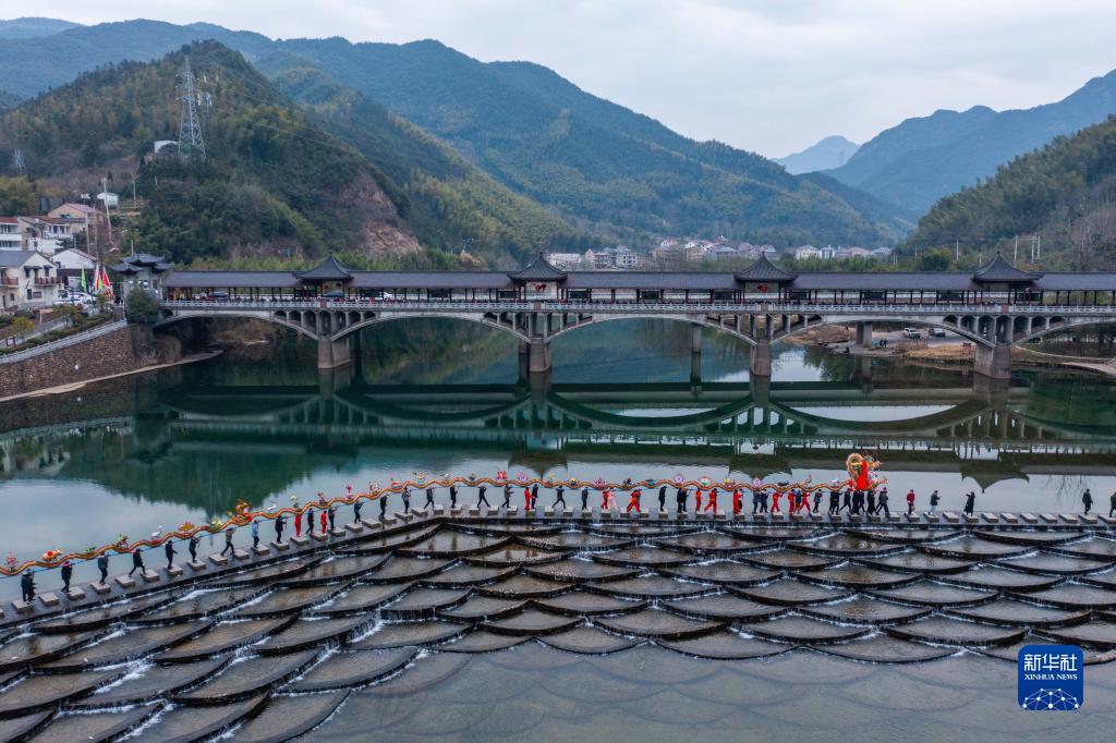 2月1日,窈口村女子板龍隊在湖源鄉的龍鱗壩碇步橋上進行舞龍表演(無人機照片)。