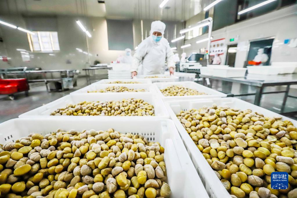 2月1日,工人在位于河北省遵化市堡子店鎮一食品集團車間加工出口栗仁。