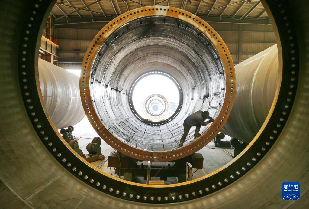 2月1日,江蘇連云港經濟技術開發區一風力設備制造企業車間,工人在趕制風電塔架。