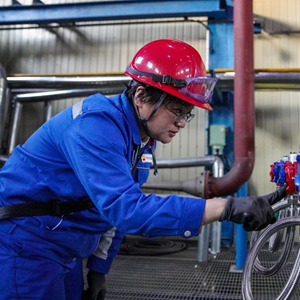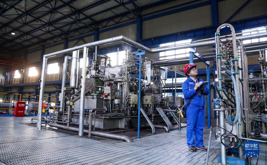 李艷在中國石油吉林石化公司煉油廠車間內巡檢(2022年11月8日攝)。