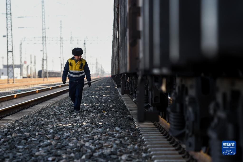 2月1日,呼和浩特南站的工作人員在檢查運煤列車狀況。