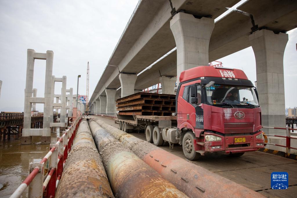 2月1日,裝載施工材料的貨車行駛在杭甬高速復線一期工程現場。