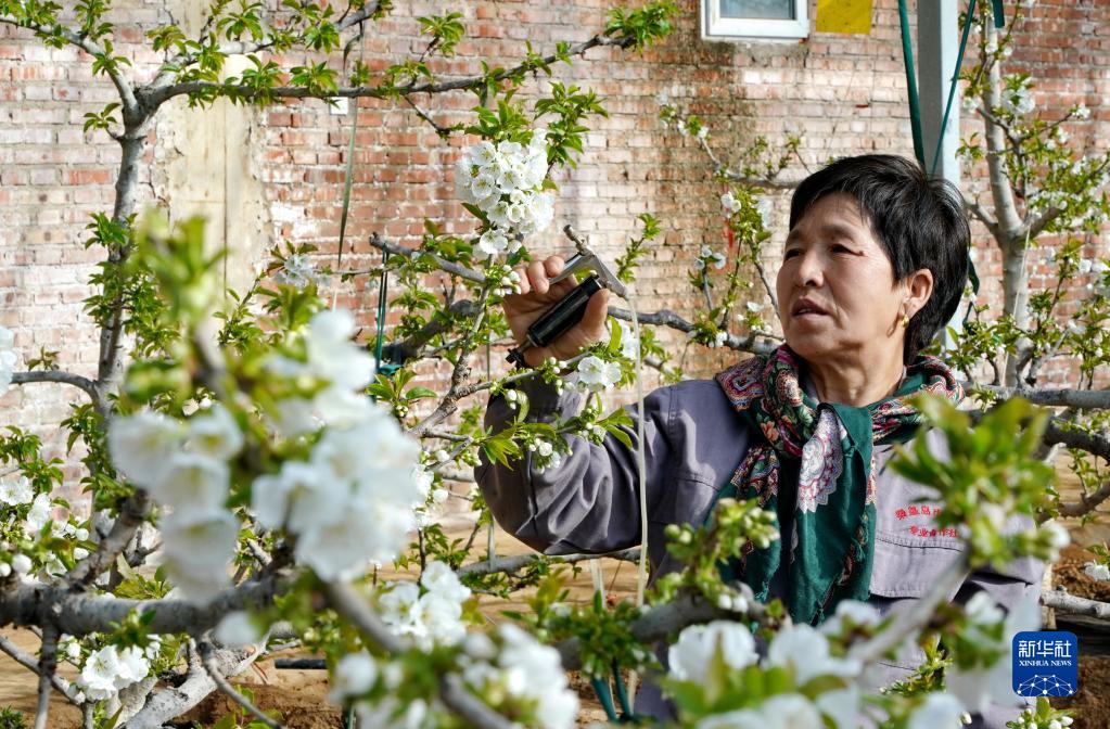 2月1日,秦皇島市撫寧區榆關鎮一家櫻桃種植合作社的社員在大棚內給櫻桃花授粉。