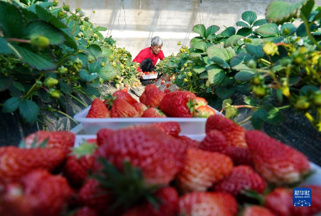 2月1日,秦皇島市撫寧區榆關鎮農民在大棚內采摘草莓。