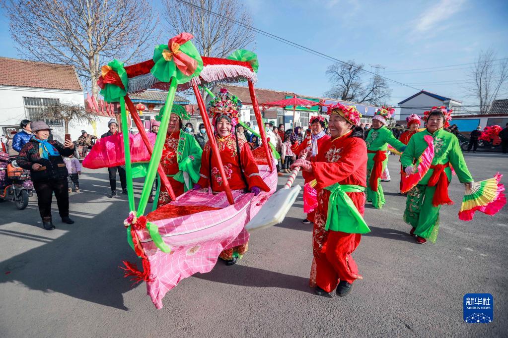 2月2日,河北省遵化市西下營滿族鄉的民間藝人在表演劃旱船。