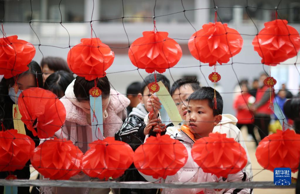 2月2日,貴州省黔東南苗族侗族自治州丹寨縣的小朋友在迎元宵活動中猜燈謎。