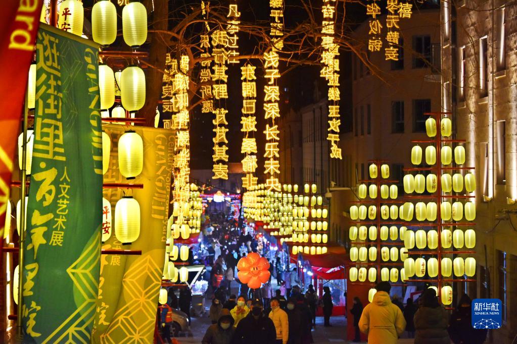元宵節臨近,青島市市南區“逛街里”新春燈會上的璀璨花燈點亮了老城區的大街小巷,吸引人們前來賞燈。