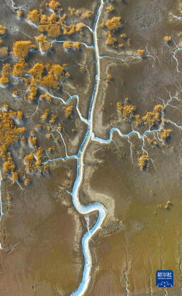 近日,在遼寧盤錦遼河口濕地,海水在潮汐作用下涌入遼河口濕地的潮溝,并凝結成冰,從高空看去,宛若蜿蜒曲折、形態各異的“冰脈”。