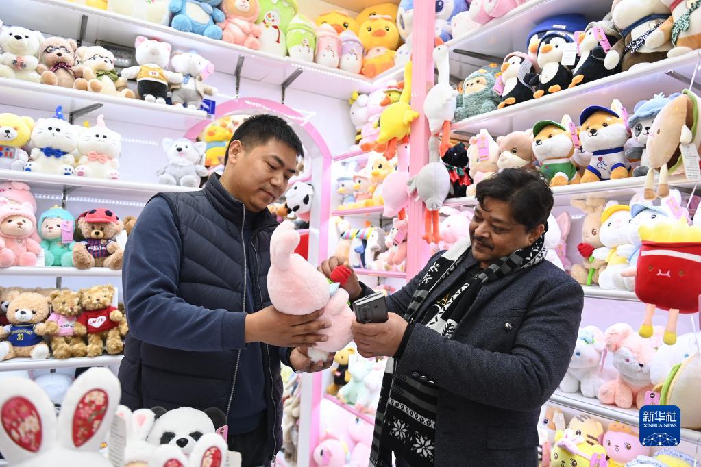 2月2日,來自印度的客商拉賈(右)在義烏國際商貿城的一家玩具店鋪內選購。