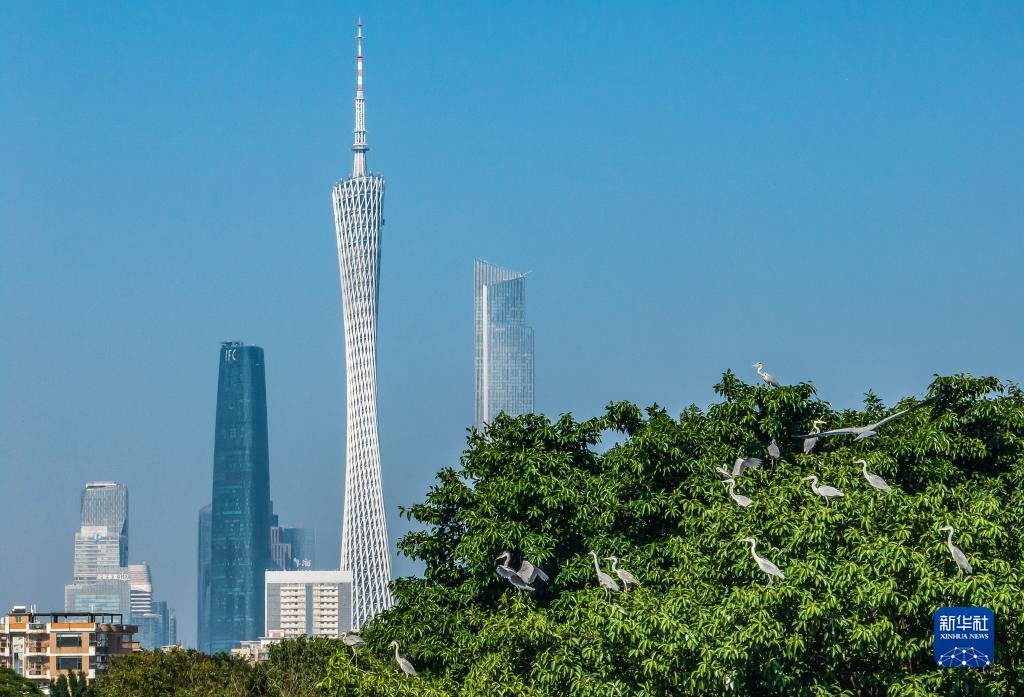 廣州海珠濕地海珠湖鳥島上的蒼鷺與背后的城市景觀相得益彰(2023年1月7日攝)。