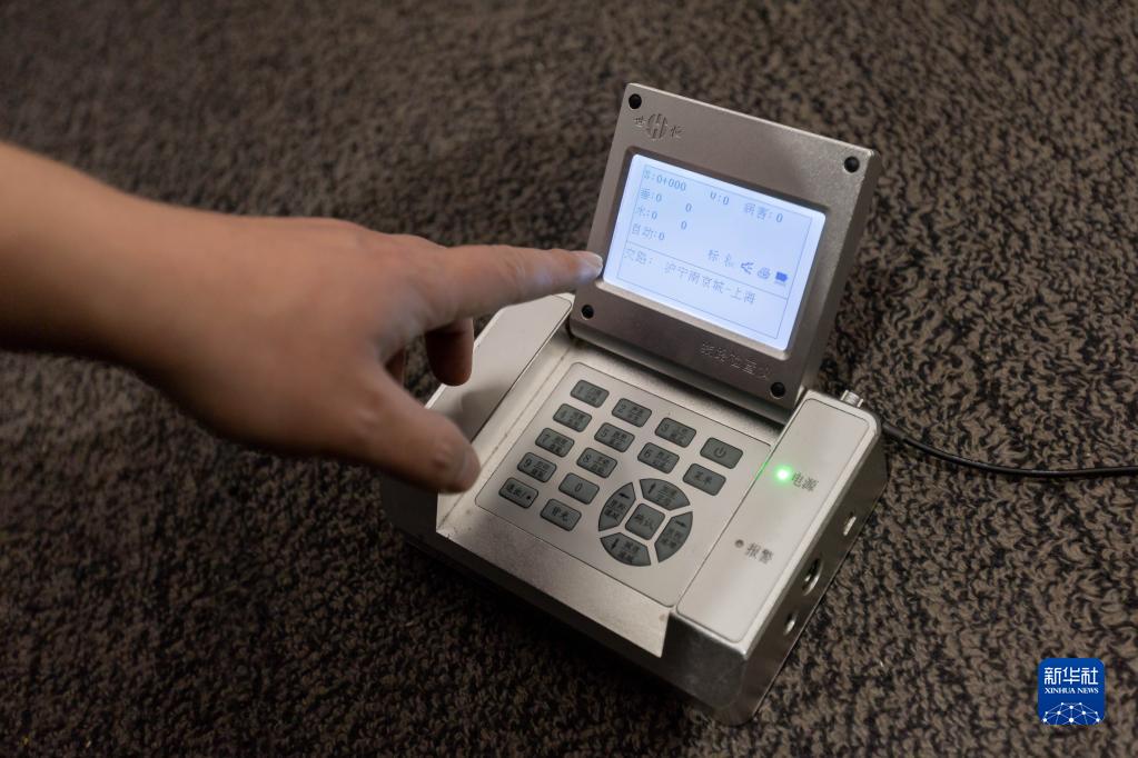 2月1日凌晨5時許在DJ7716次高鐵確認列車上拍攝的上海高鐵基礎設施段添乘人員調試好的便攜式添乘儀。該設備通過記錄列車行進中陀螺儀的數據變化,獲得線路晃動的數據,判斷列車平穩運行程度。