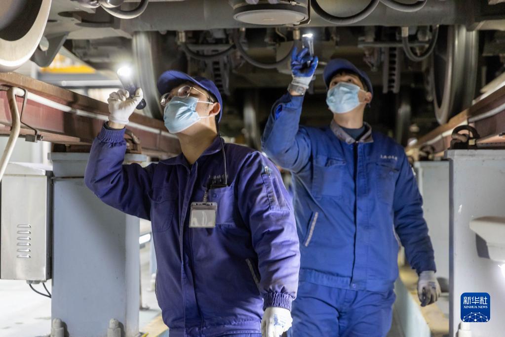 2月1日凌晨1時許,上海動車段地勤機械師檢修入庫南翔動車運用所的DJ7716次高鐵確認列車車況。