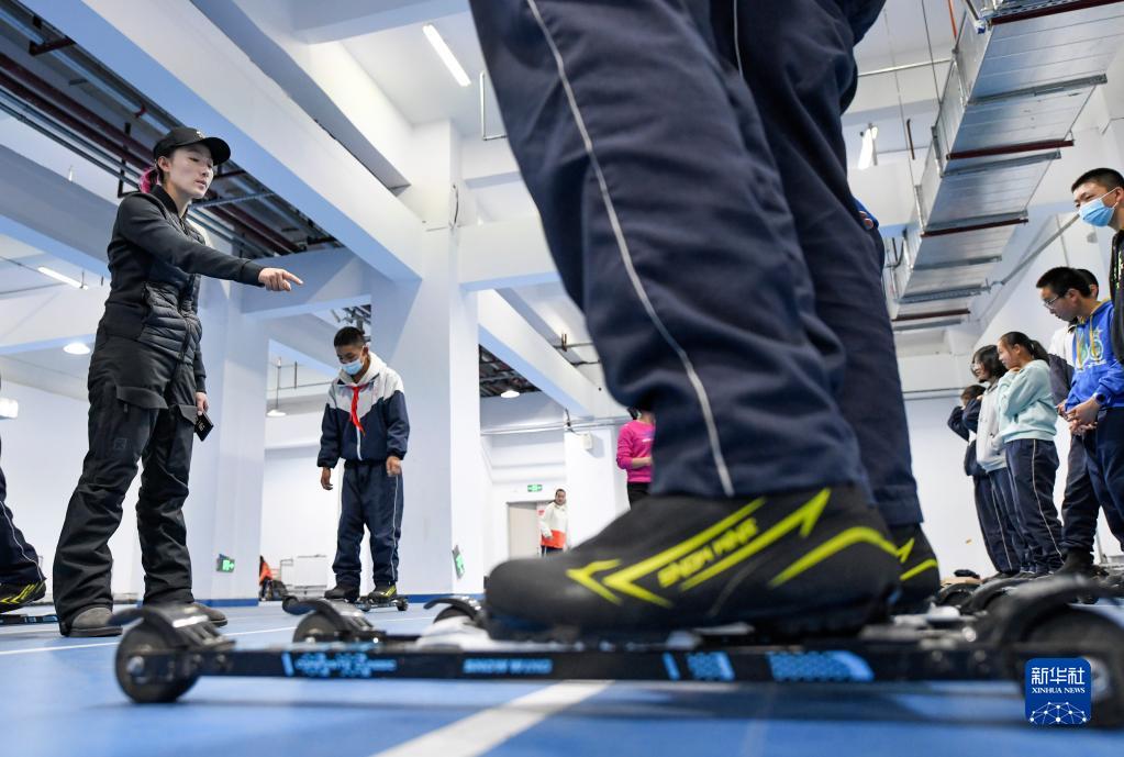 在烏魯木齊第54中學,許秀娟(左一)為學生講授越野滑輪的技巧(2021年11月16日攝)。