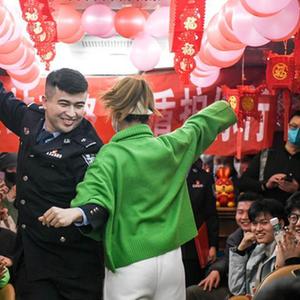 2月1日晚,在“中國雪都·阿勒泰號”冰雪旅游專列上,乘警支隊民警尼加提·買買提與旅客一起跳起麥西來甫。