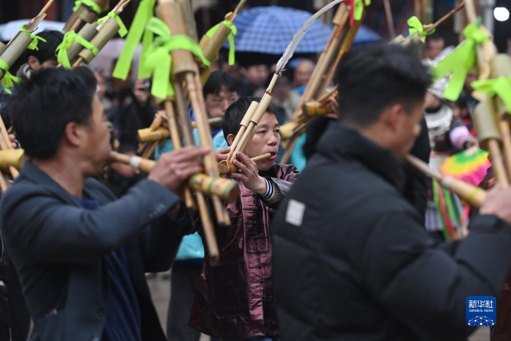 2月2日,融水苗族自治縣桿洞鄉黨鳩村苗族同胞在吹蘆笙。