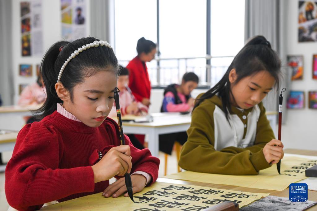 2月2日,在廣西興業縣至德小學,學生們在練習書法。