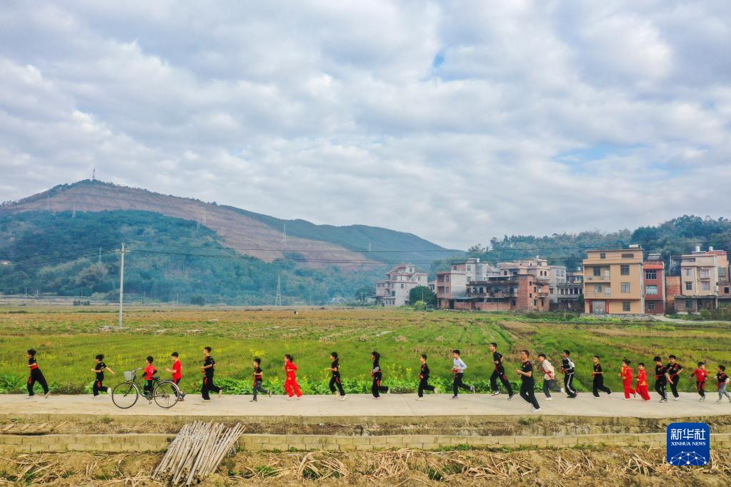 2月2日,在廣西興業縣石南鎮東周村,教練帶領孩子們跑步熱身(無人機照片)。